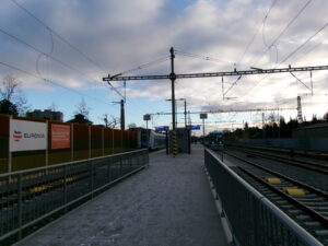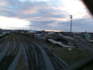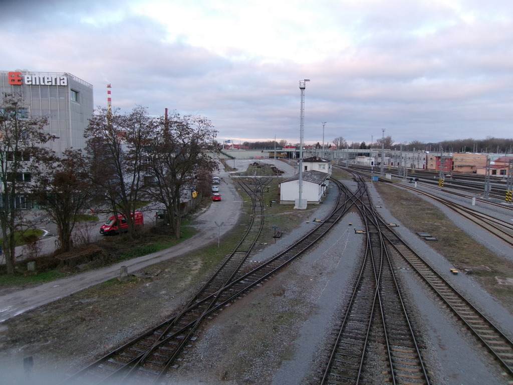 První tři účastníci, vč. organizátora a autora tohoto příspěvku v jedné osobě, se sešli už ve vlaku z Moravy do Pardubic. Tedy 2 členové a jedna ze tří hostů, jediná dáma projížďky. Na prvním srazu se ještě objevil Máca, který se ale s námi ihned rozloučil s tím, že si chce projít ráno Nymburk a potkáme se tam. Po prvním srazu jsme přešli po prvním nástupišti k loni nově otevřené lávce přes kolejiště a prošli jsme si ji. Z jejího „zadního“ konce je pěkně z nadhledu vidět jinak neznámé kolejiště včetně toho, že příjezdové koleje dvou skupin kolejí se kříží jednoduchou křižovatkou.