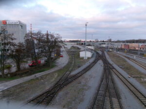 Pohled z lávky ve stanici Pardubice hl. n. na zadní část kolejiště (levá strana – směr Česká Třebová). Na levém okraji je vidět kousek posledního nástupiště.