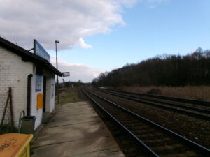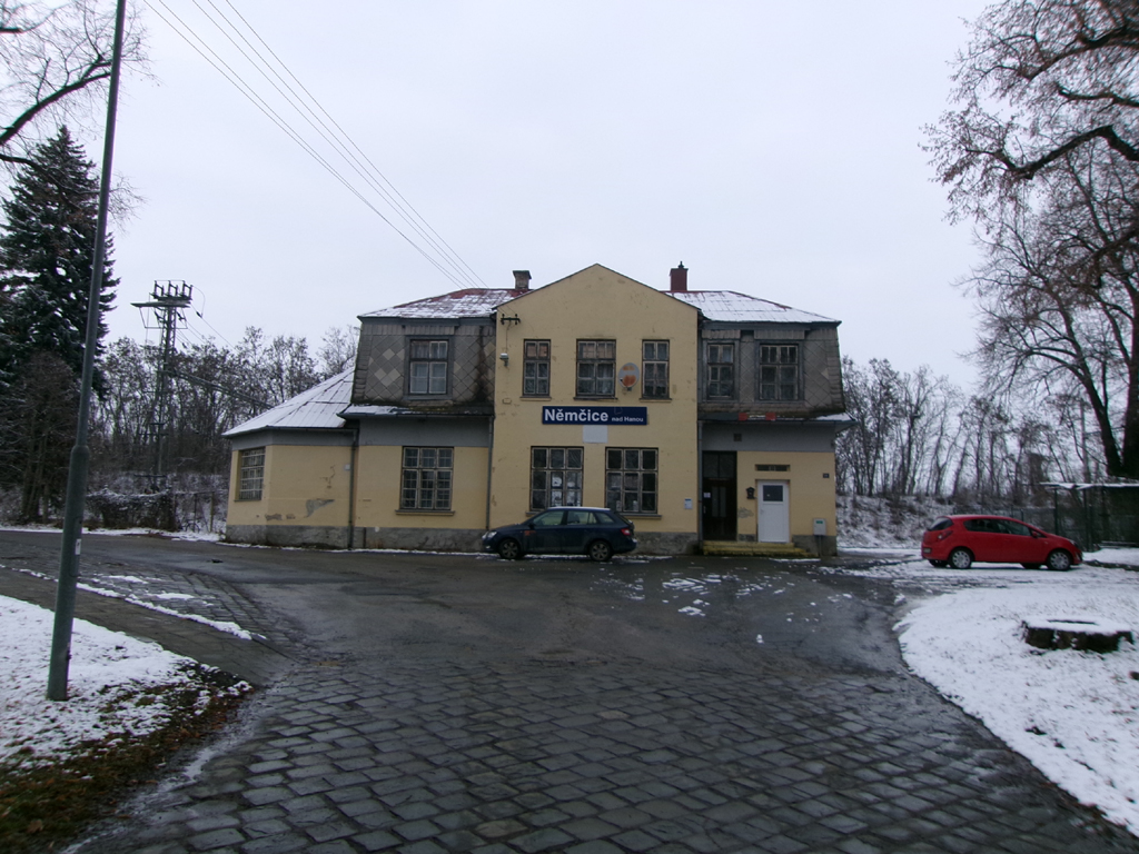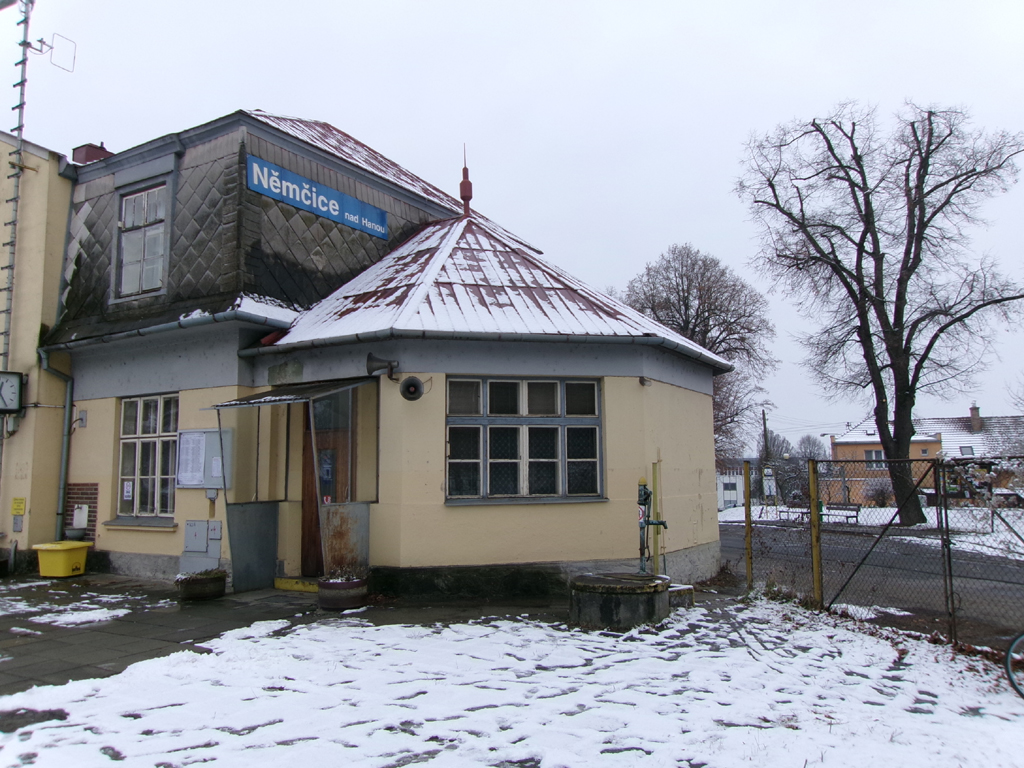 Po setkání u vlaku jsme pokračovali do Němčic nad Hanou. Zde je velice zajímavá atypická budova, která se ovšem ocitne po přestavbě trati mimo koleje, protože bude stanice přesunuta do levotočivého oblouku na západním zhlaví a trať zde bude téměř přímá a bude se zhruba dotýkat ze severu té dnešní. Na poli už byly vidět nějaké zemní práce i když zahájení stavby má teprve přijít. Vzhledem k tomu, že jsme ani jeden v centru nebyli, došli jsme tam společně. Cestou nás zaujala dvojice kolejí vedoucí přes cestu souběžnou s kolejištěm stanice. „Přejezd“ je dokonce označen ze směru od nádraží dopravní značkou, tzv. „ondřejský“ kříž (v opačném směru již neexistuje). Nicméně drážní vozidla na tento přejezd již nedojedou a směr pokračuje na parkoviště novodobých rodinných domků se zámkovou dlažbou. Jedná se o bývalou vlečku cukrovaru, který ležel až za hlavní silnicí. Po návratu z města došlo i na dokumentování dalších staveb v prostoru nádraží.