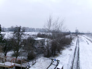 Druhou zastávkou pak byl Kojetín. Zde jsme se nejprve vydali směrem do města a pak došlo i na stanici. A vzhledem k rozdílné znalosti Kojetína jsme se rozdělili. Na nádraží to byla samozřejmě staniční budova, známý „hrad“ stojící vedle jižního konce budovy (měl by představovat zaniklý kojetínský hrad, který byl prozkoumán na začátku 20. století a dnes je bohužel málo zřetelný, protože byl celý přetvořen na zahrádkářskou kolonii). Dále pohled z ptačí perspektivy (ptáka sedícího na lávce nad kolejištěm) a minikolejiště vlečky ležící v prostoru za kolejištěm stanice, přístupné právě touto lávkou.