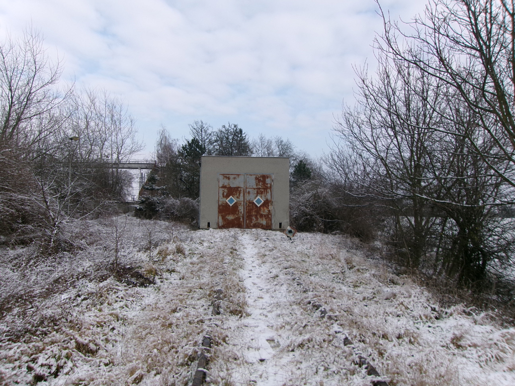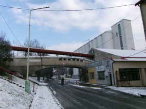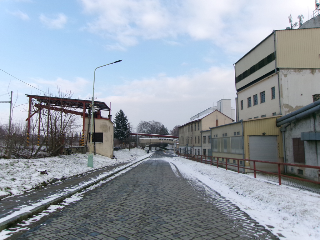 Přes příjezdovou cestu vede takovýto pěkný betonový most. Nad ním vede potrubí, kterým se zřejmě dopravuje do sladovny zrní pro výrobu sladu dovážené na nádraží.
