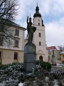 Centrum města. Pohled na kostel a za ním stojící zámek, který je ale nepřístupný.