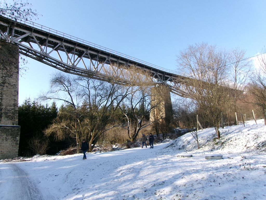 Po uvítání a ofocení nádraží i zde stojícího modelu Štefánikovy mohyly na Bradle (mohyla je v měřítku 1:30 a diskutovali jsme, jestli se to vztahuje i na napadaný sníh; Vzhledem k tomu, že na mohyle mohl ležet tak ve vrstvě 1–2 cm, tak by to v reálu mohlo podle mne souhlasit) jsme se vydali k vlastnímu cíli a to byly 2 velké mosty (mosty jsou popsány např. v článku na servru rail.sk: https://www.rail.sk/skhist/mosty/121.htm). Jako první jsme si vybrali ten, který leží z našeho pohledu až za stanicí – Myjavský. Cesta pod něj byla ztížena kluzkým sněhem. Jedná se o 4 pole příhradové konstrukce s horní mostovkou ležící v oblouku na 3 vysokých pilířích. Nosník nejvzdálenějšího pole je obdélníkový, ostatní mají průřez proměnný, zhruba prostřední třetina je vyšší, pak se rovnoměrně snižuje a nad pilíři je vysoký stejně jako ten poslední.
