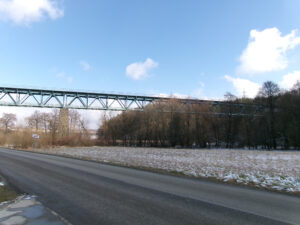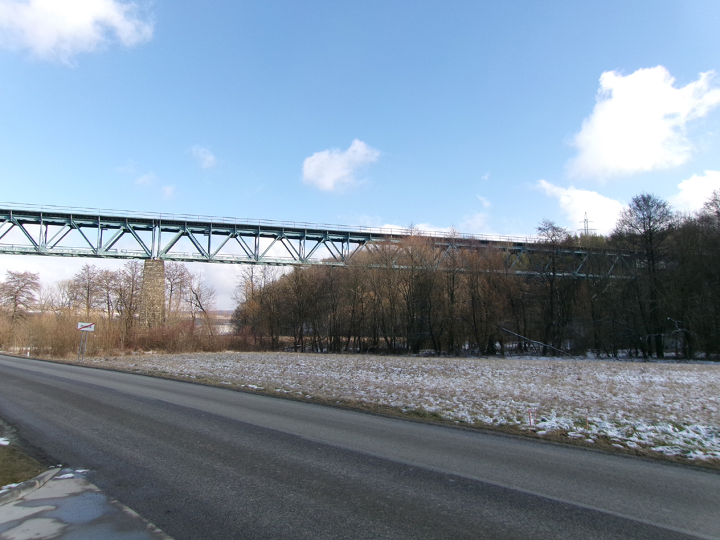 Západní část Devánského viaduktu blíže k nám. Je vidět, že krajní pole je plnostěnné. Nad silnicí je poslední příhradové pole a je vidět ještě více jak polovina předposledního příhradového pole.