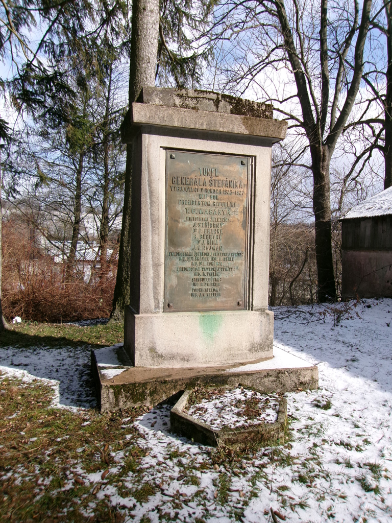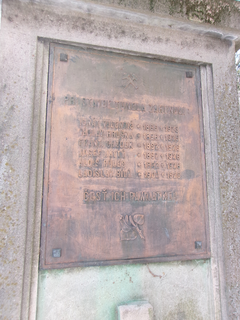 Směrem od kolejiště je ještě jedna, méně veselá tabule: „Při stavbe tunela zahynuli: Ignát Valentić * 1866 † 1923, Václav Hruška * 1896 † 1925, Frant. Gazdek * 1892 † 1926, Josef Jattý * 1892 † 1926, Alois Pulec * 1902 † 1926, Ladislav Bílý * 1902 † 1926. Čest ich pamiatke!“