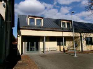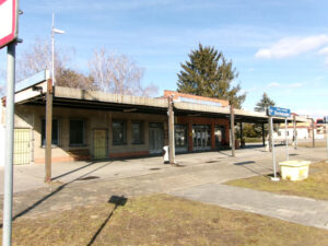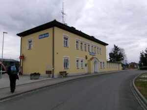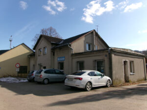 Toto je nová výpravní budova stanice Bylnice vč. pokladny. Na levém okraji je boční stěna staré budovy.